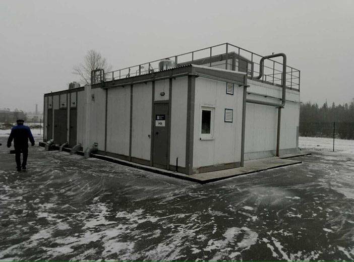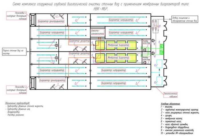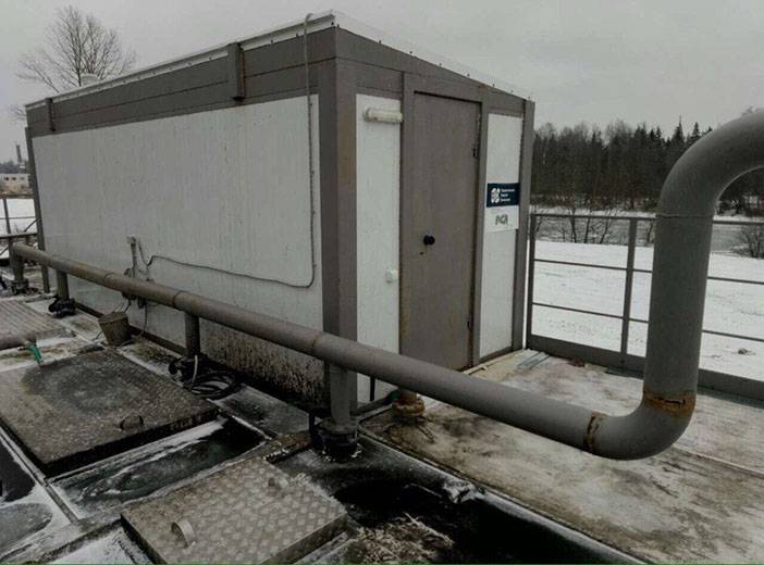 В состав очистных сооружений входит технологический павильон, где располагаются насосы, реагентное хозяйство, установка обезвоживания осадка и воздуходувка. Воздуходувка подает воздух в усреднительную емкость, аэротенки-нитрификаторы и под мембранные кассеты.