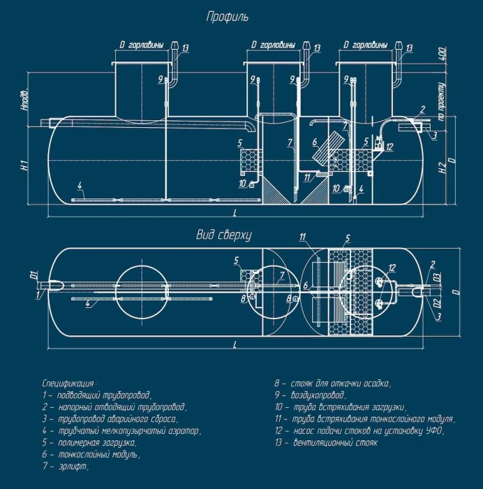 Составляющие очистной станции: стеклопластиковый резервуар, подводящие и отводящие патрубки, лестницы, эрлифты, стояки откачки осадка, крышки колодцев, компрессоры, аэраторы, биофильтры.